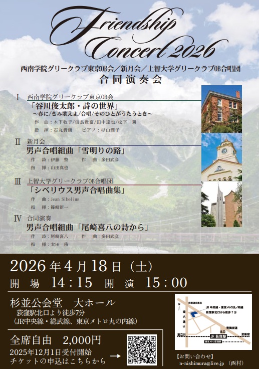 Friendship Concert 2026 西南学院グリークラブ東京OB会/新月会/上智大学グリークラブOB合唱団 合同演奏会