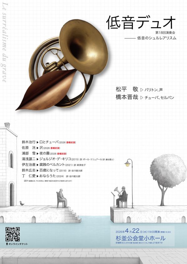 出演:松平敬(バリトン、声)、橋本晋哉(チューバ、セルパン)プログラム:鈴木治行《口とチューバ》、佐原洸《沢》、浦部雪《夜の霧》、鈴木広志《百歳になって》、湯浅譲二《ジョルジオ・デ・キリコ》、伊佐治直《腐蝕のベルカント》、丁仁愛《おならうた》