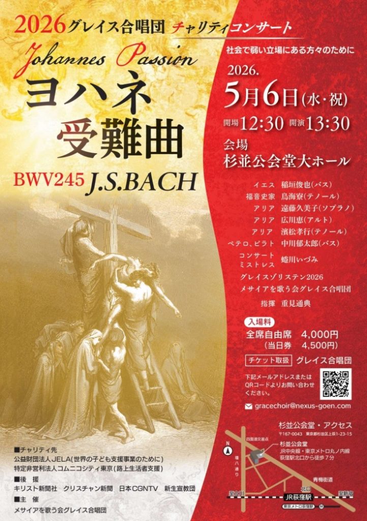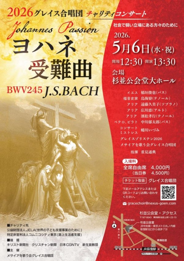 J.S.バッハ《ヨハネ受難曲》を上演するチャリティコンサート。実力派ソリストと合唱団、オーケストラが結集し、深い信仰と音楽の感動をお届けします。社会的弱者支援のための特別公演です。